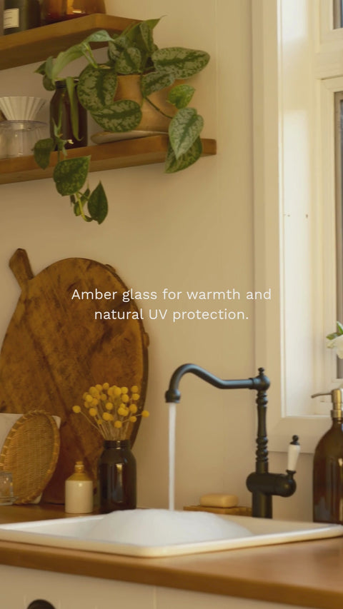 Hecha con hasta un 45% de vidrio reciclado, la botella de vidrio ámbar se fabrica con orgullo en el Reino Unido y Europa, ofreciendo una alternativa sostenible y ecológica a los dispensadores de plástico tradicionales.
